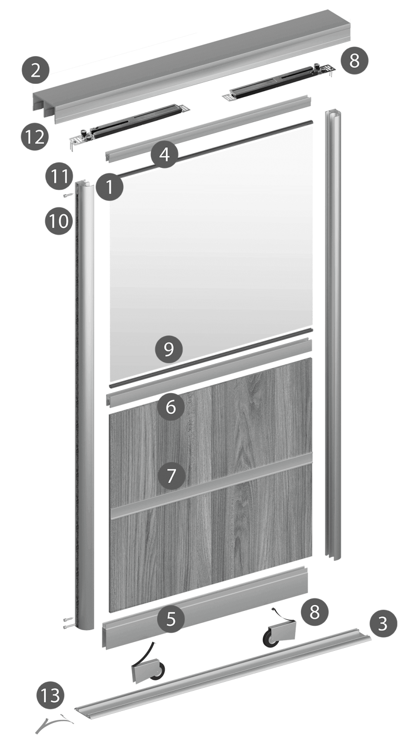 Система Эко-Лайт с использованием плиты (ЛДСП/МДФ) 16 мм - одна из наиболее доступных по цене раздвижных систем. Для установки роликов нет необходимости фрезеровать полотно двери. Ролики крепятся накладным способом на внутреннюю сторону, упрощая сборку дверей.